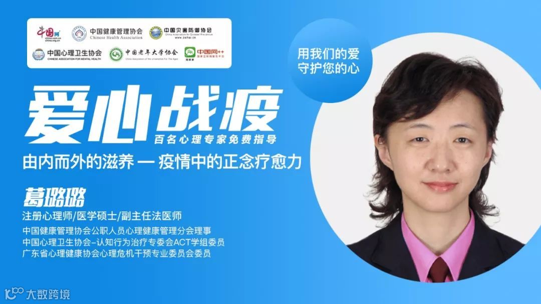 2月11日,我们将会邀请到注册心理师、中国健康管理协会公职人员心理健康管理分会理事、中国心理卫生协会-认知行为治疗专委会ACT学组委员、广东省心理健康协会心理危机干预专业委员会委员、医学硕士、副主任法医师葛璐璐,葛老师将以生活中的正念练习为主线,邀请您开启通往内在的旅程。敬请关注!