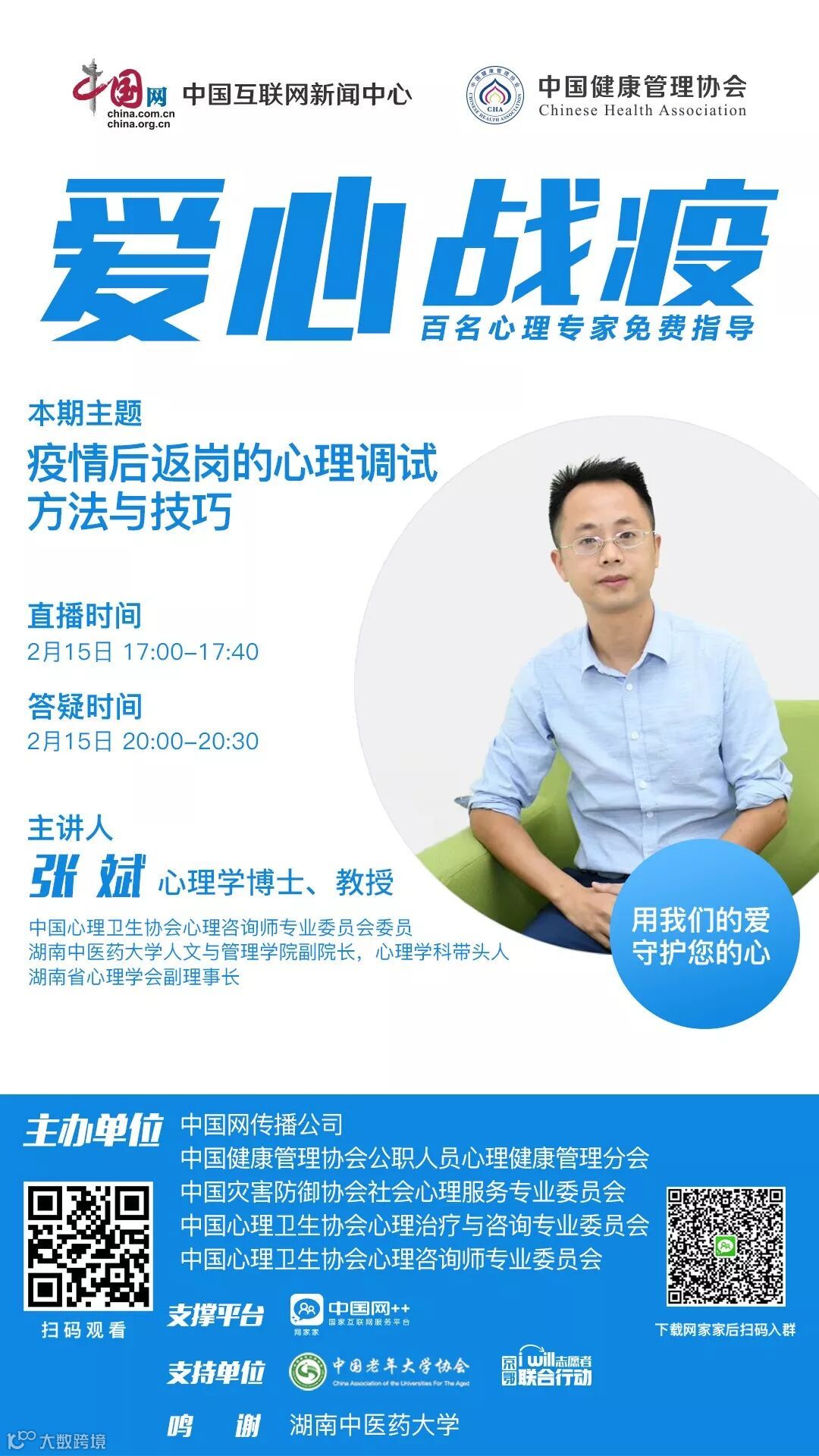 网家家APP推出大型疫情防控心理知识系列主题直播暨专家在线答疑指导活动“爱心战疫”,全力狙击“新冠肺炎”!百名心理专家免费在线指导答疑,从心理学的视角为大家,科普新冠肺炎的心理学防疫知识,更有爱心特群24小时鼎力加持,靶向瞄准、精准阻击新冠肺炎!本期邀请到中国心理卫生协会心理咨询师专业委员会委员、湖南中医药大学人文与管理学院副院长、心理学博士张斌教授针对返岗所面临的焦虑、抑郁、恐惧、疑病、强迫等心理问题提出应对方法与技巧。