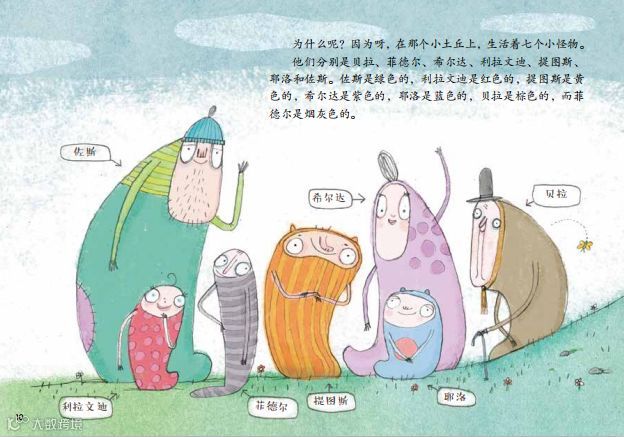为什么呢?因为呀,在那个小土丘上,生活着七个小怪物。他们分别是贝拉、菲德尔、希尔达、利拉文迪、提图斯、 耶洛和佐斯。佐斯是绿色的,利拉文迪是红色的,提图斯是黄 色的,希尔达是紫色的,耶洛是蓝色的,贝拉是棕色的,而菲德尔是烟灰色的。