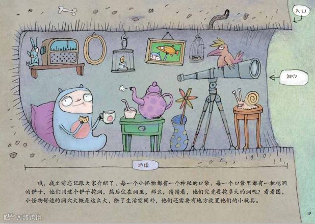 哦,我之前忘记跟大家介绍了,每一个小怪物都有一个神秘的口袋,每一个口袋里都有一把挖洞 的铲子,他们用这个铲子挖洞,然后住在洞里。那么,猜猜看,他们究竟要挖多大的洞呢?看看图,小怪物舒适的洞穴大概是这么大,除了生活空间外,他们还需要有地方放置他们的小玩具。