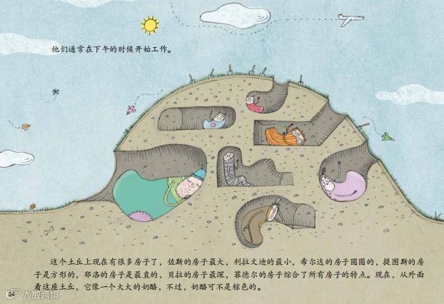 所以,他们非常喜欢这个土丘,这个土丘不硬也不软,简直是完美的住所。他们在土丘上跑来跑去,从这儿跑到那儿,从上跑到下,越来越喜欢这个地方。