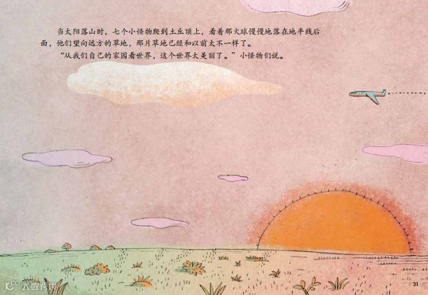 当太阳落山时,七个小怪物爬到土丘顶上,看着那火球慢慢地落在地平线后 面,他们望向远方的草地,那片草地已经和以前太不一样了。“从我们自己的家园看世界,这个世界太美丽了。”小怪物们说。