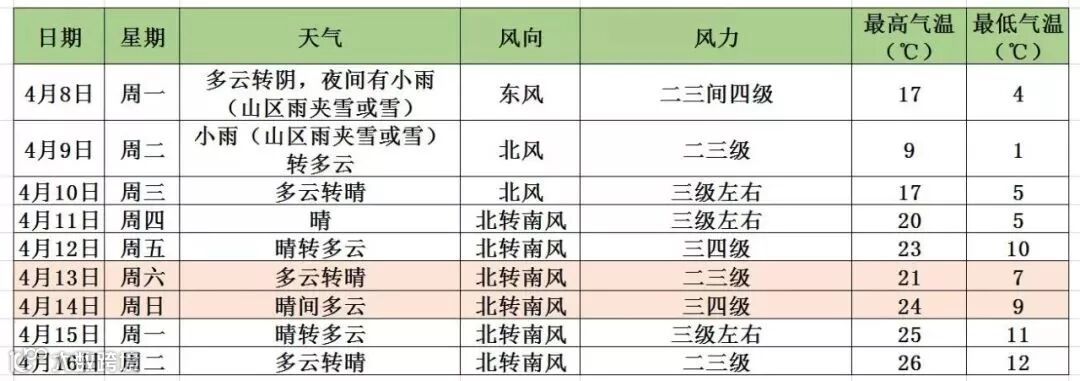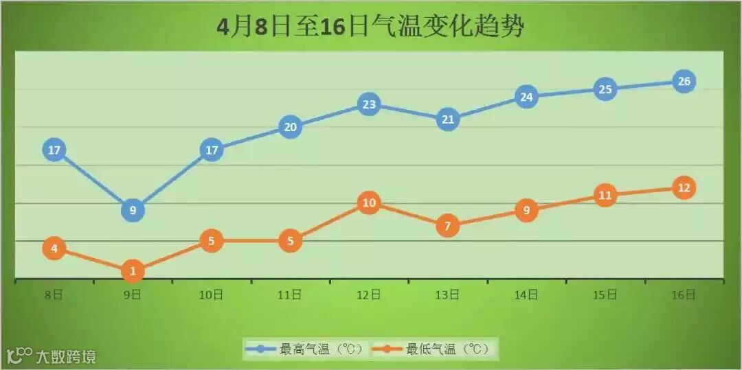 4月8日至16日白天最高气温9~26℃,夜间最低气温1~12℃。春天天气反复无常,而且昼夜温差较大,请注意适当调整着装。