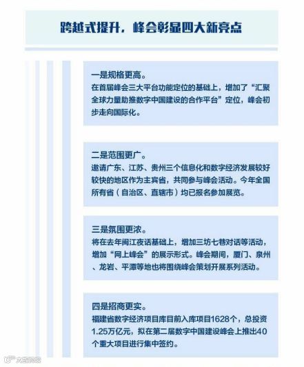 数字中国建设峰会是中国信息化发展政策发布平台、电子政务和数字经济发展成果展示平台、数字中国建设理论经验和实践交流平台。数据显示,截至2018年底,我国数字经济规模已达31万亿元,占GDP的三分之一。首届数字中国建设峰会以来,全国总投资3000亿元的400个数字经济重大项目正在陆续开工建设。