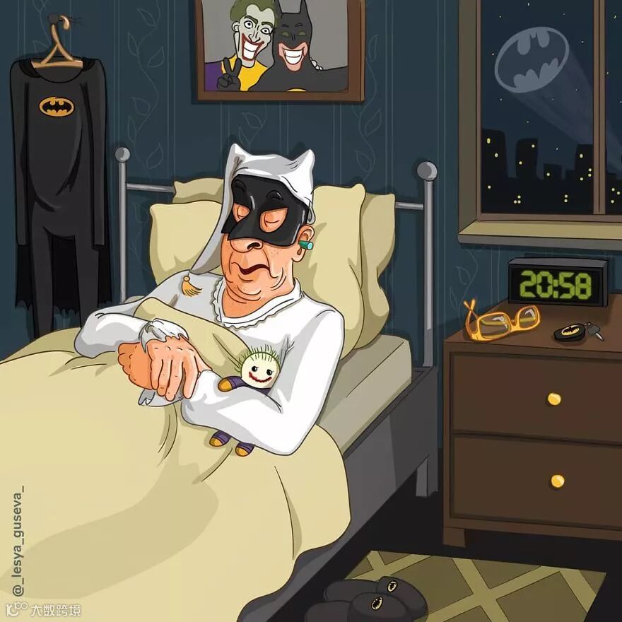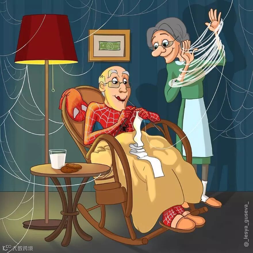 俄罗斯艺术家Lesya Guseva就创作了这样一系列名为“退休人员”的漫画,让我们可以更容易地想象这些场景。她描绘了很多我们喜欢的来自漫威、DC和迪士尼的漫画人物以及超级英雄,他们最终退休了,开始享受老年人的正常生活。你想象过雷神Thor帮小孙子做鸟舍、蜘蛛侠和妻子一起织衣服还有米奇和米妮在迪士尼庆祝90大寿的场景吗?话不多说,快来看看吧~