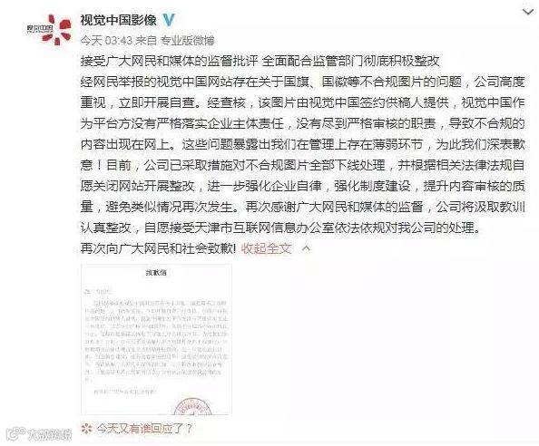4月12日凌晨,视觉中国在接受天津市委网信办约谈后,连夜发出致歉信。