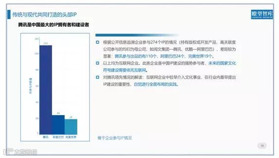 作为全球最大的互联网公司之一,腾讯在IP建设的领先情况较易解读:它在互联网企业中较早介入文化事业,在行业内也最早提出IP建设的重要性,自觉进行全面布局的实践。