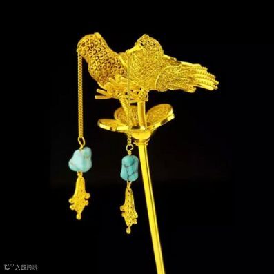 唐宋以来,花丝技艺被更广泛地运用到了妇女的发髻样式和首饰上。西安出土的一件金花饰外层由8朵小花组成菱形,中间突起的一组花中站立一小鸟,花间用极细的金丝绕结,镶翠玉小片,小巧玲珑,是唐代花丝首饰的优秀之作。