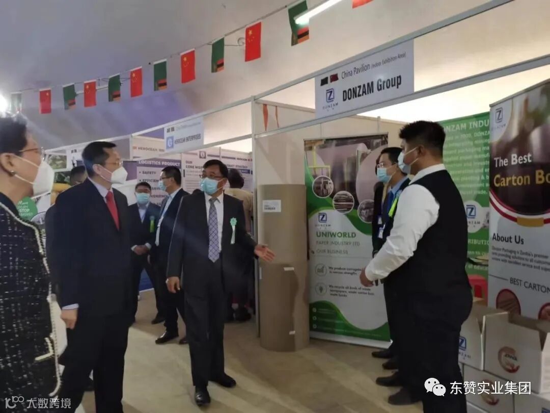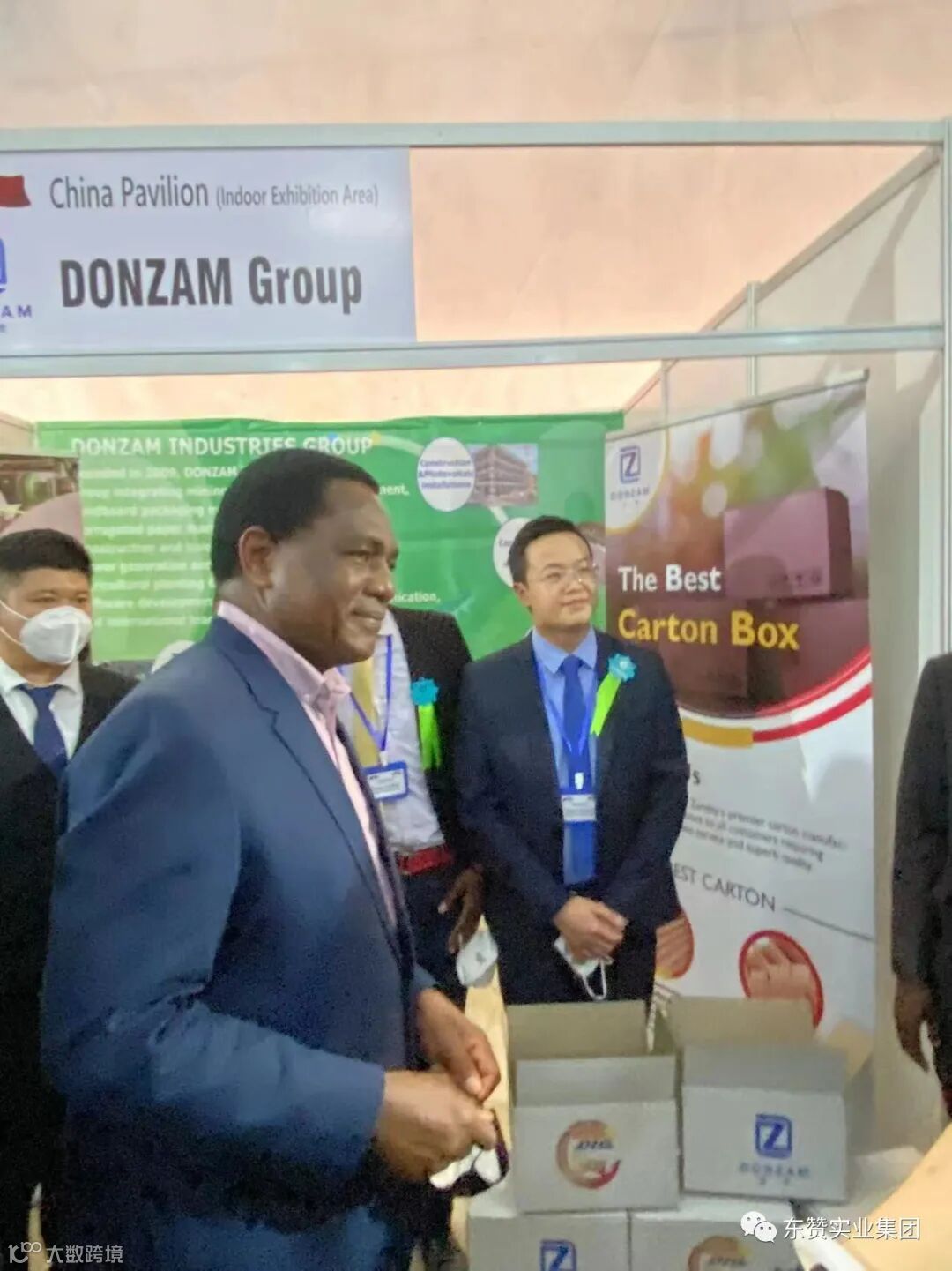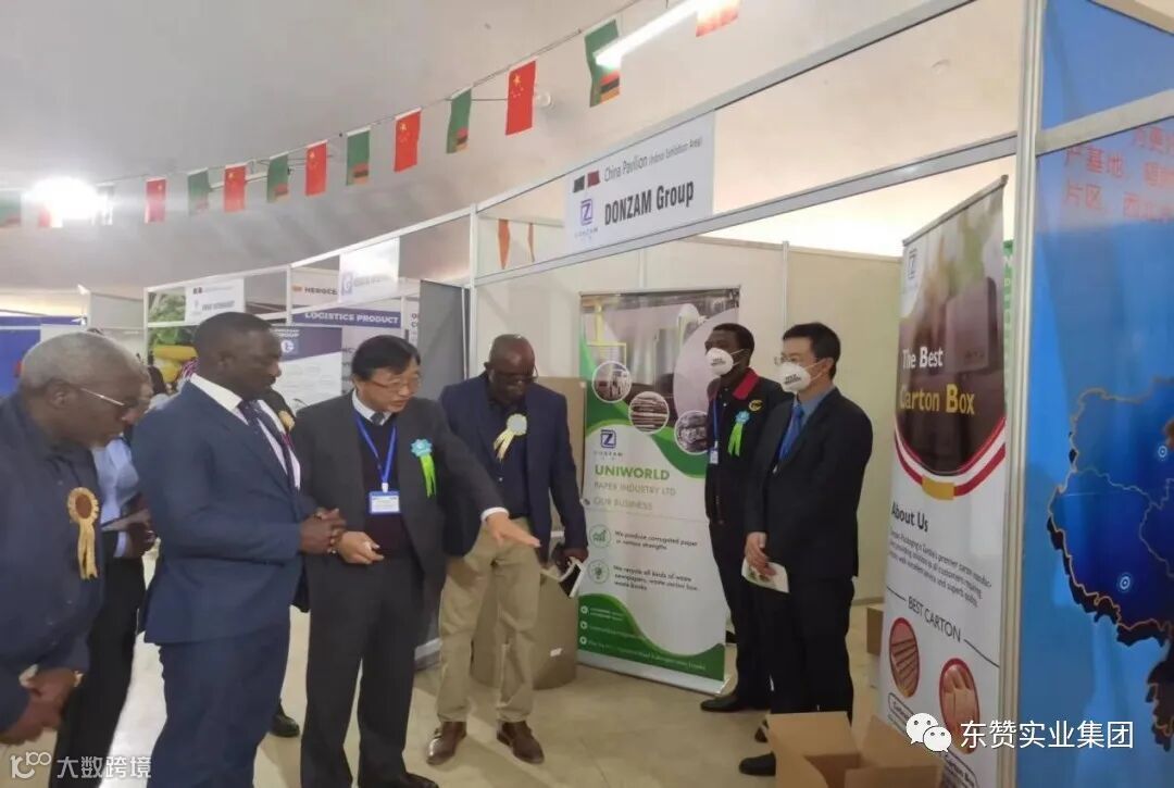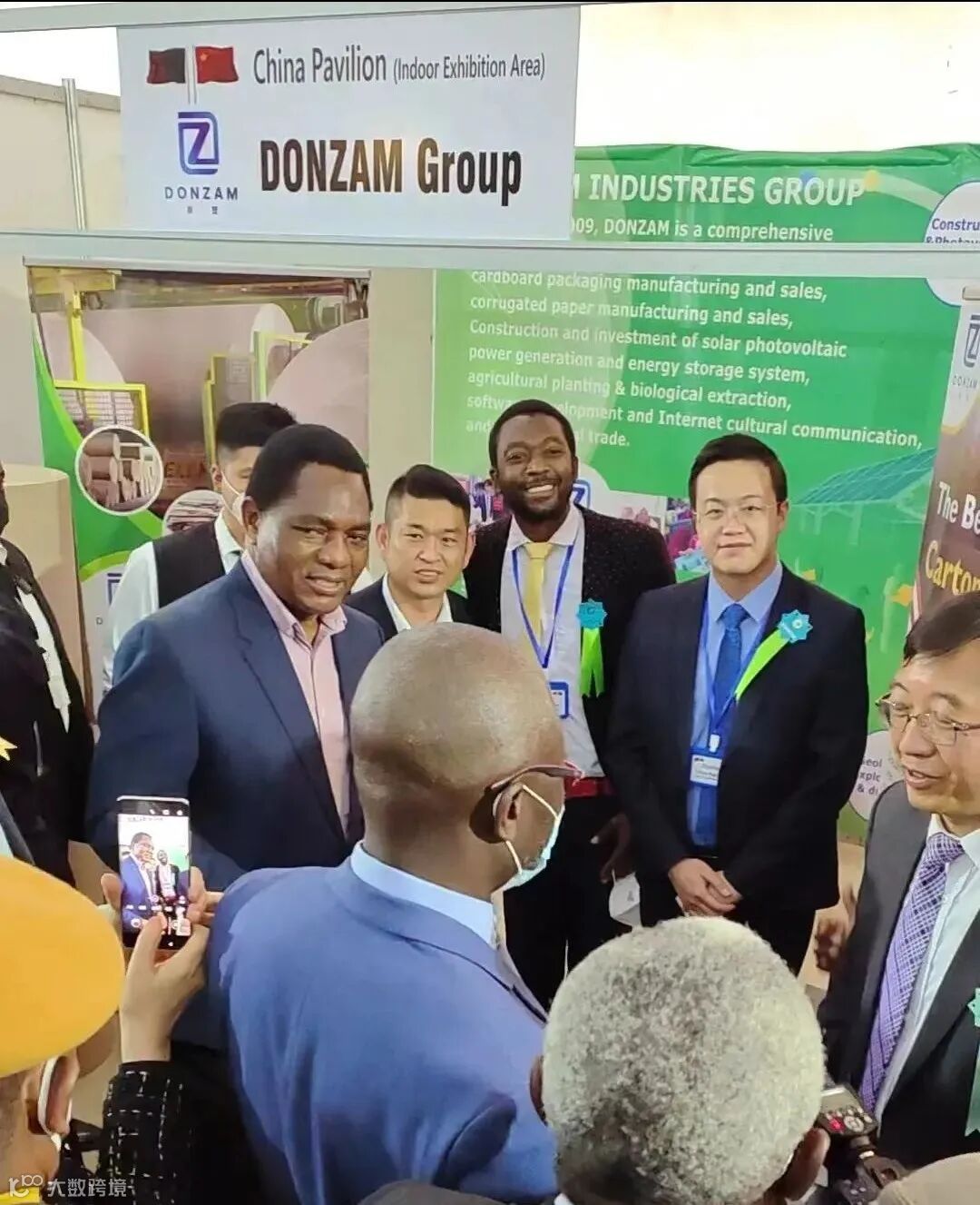 总统在路过我公司展位时被我公司的参展产品吸引住了,特意在东赞展位前停留听取公司工作人员对我们展销产品的讲解。称赞我们生产的纸箱及瓦楞纸,肯定了我们变废为宝,循环持续利用的生产模式和理念。鼓励更多像东赞这样的中国企业通过在当地建立工厂,增加当地就业并不断提高赞比亚的工业生产水平,并希望我公司生产的产品能够早日出口到更多国家,为赞比亚出口创汇。
