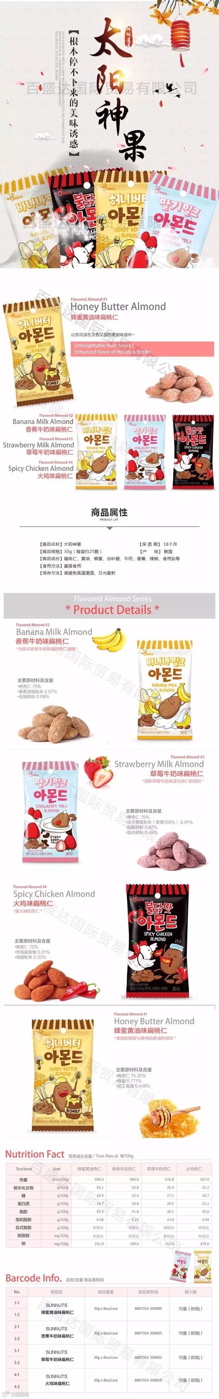 导读:威海百盛达新品推荐:来自韩国原装进口的太阳神果sunnuts火鸡味/黄油蜂蜜味/香蕉牛奶味/草莓牛奶味扁桃仁