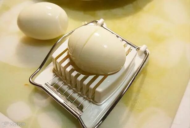 铛铛铛!!!水煮蛋来啦!马上拿出鸡蛋切片器,先把水煮蛋放好,切成横的还是竖的,都OK啦~