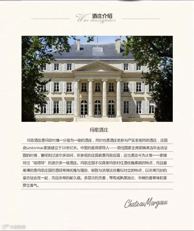 胡锦涛主席出访法国时曾到过此处,当时用来款待他的就是1982年的玛歌酒。