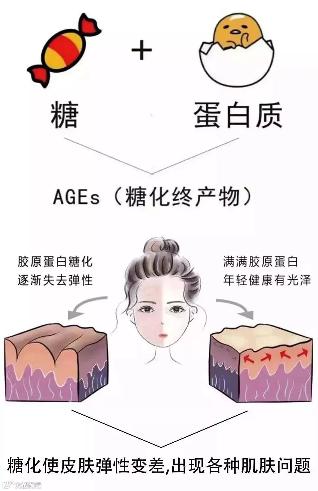 简单来讲,糖化,就是血液中的葡萄糖与蛋白质结合的过程。血液中的葡萄糖会拉上身体中的自由基衍生物,与蛋白质产生一种化学碰撞,碰撞的结果就是AGEs。