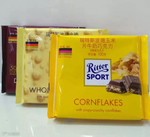 德国Ritter sport 瑞特斯波德全榛子白巧克力/黑巧克力/玉米片牛奶巧克力