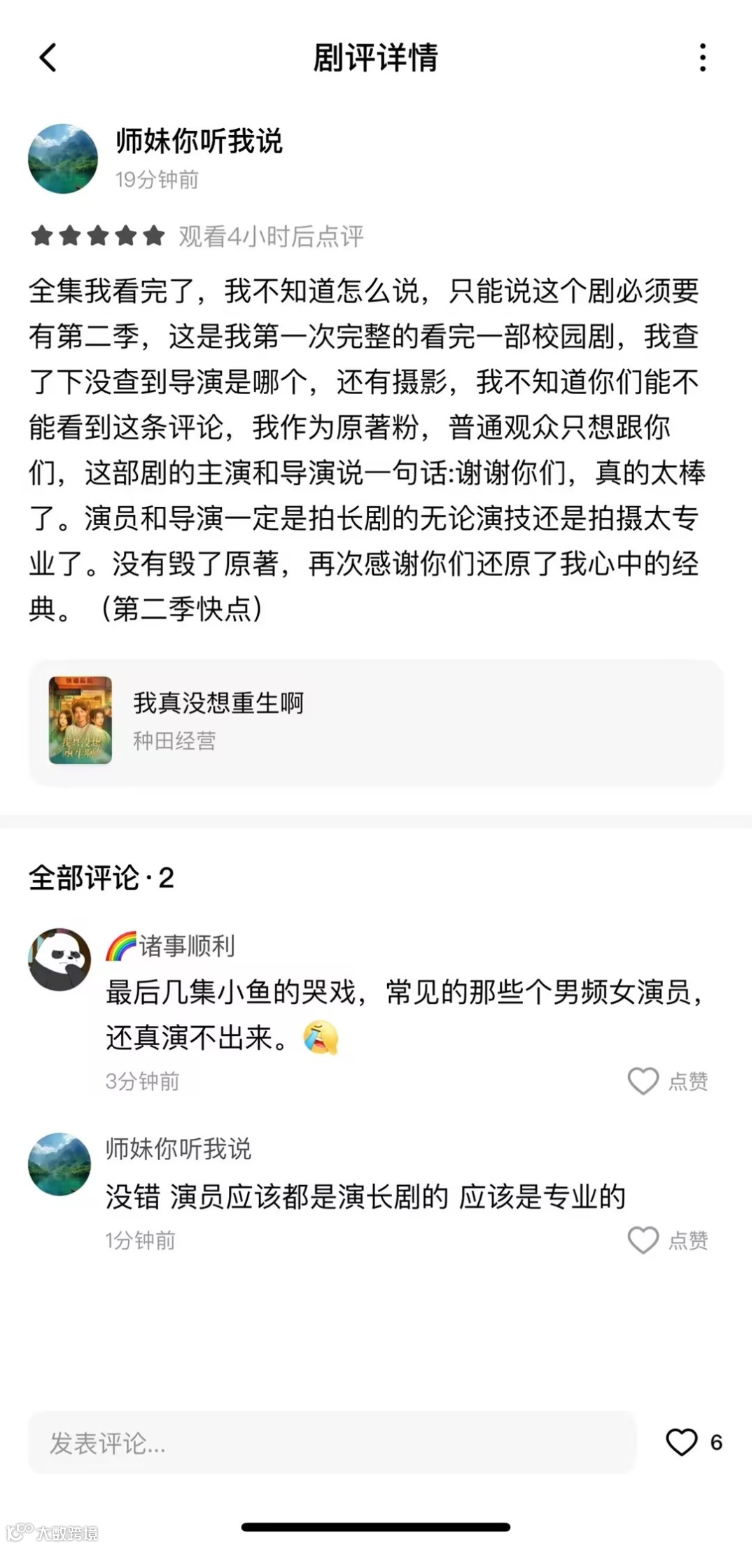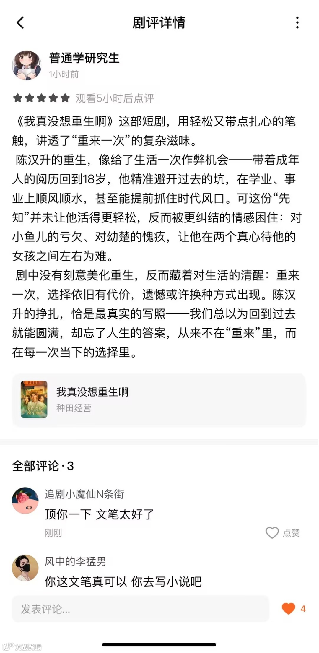 《我真没想重生啊》的破圈,不仅是一部作品的成功,更是中国短剧产业升级的号角。当我们的短剧开始关注情感深度、制作质量和文化表达时,它们就已经具备了走向世界的底气。在短剧出海的大潮中,中国内容正迎来属于自己的历史机遇。