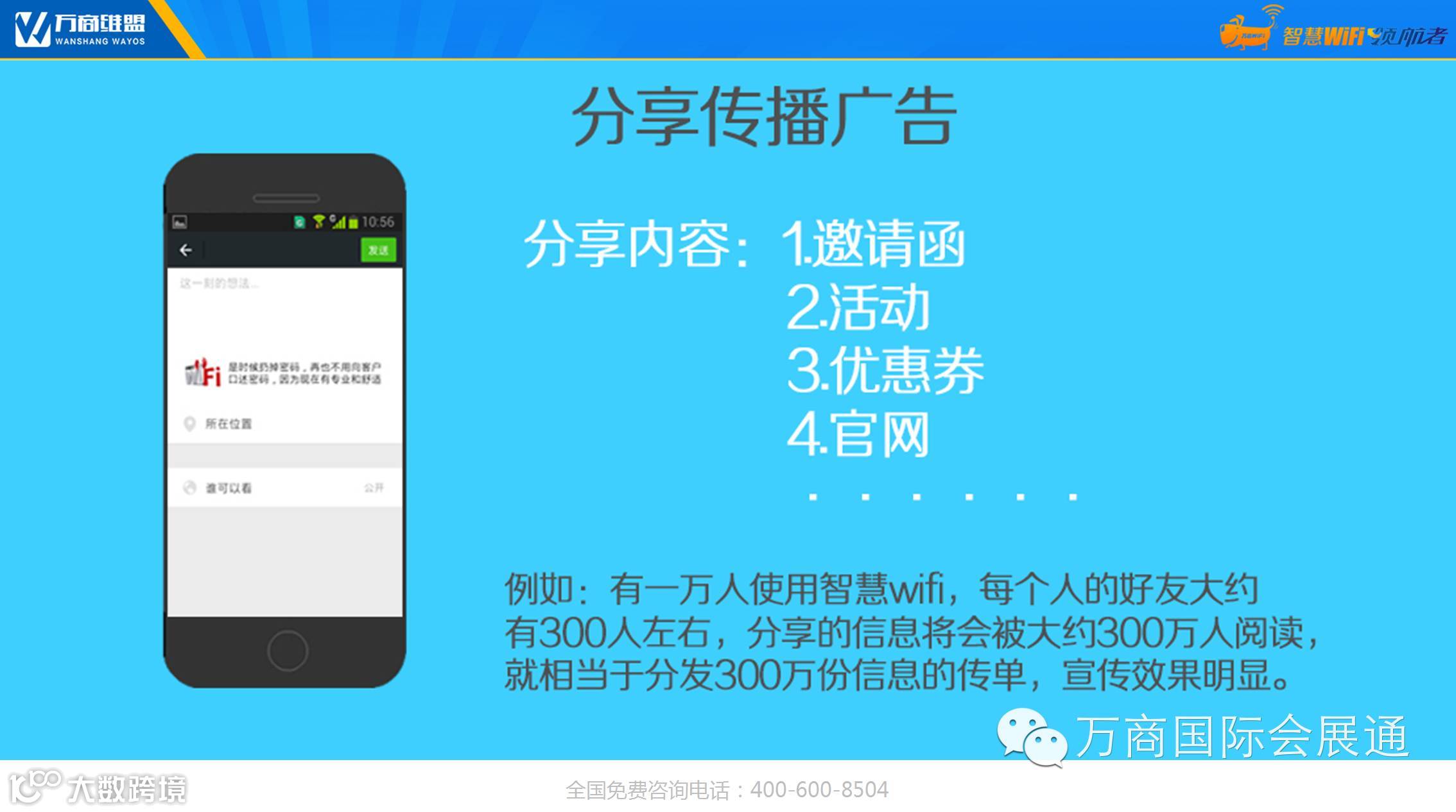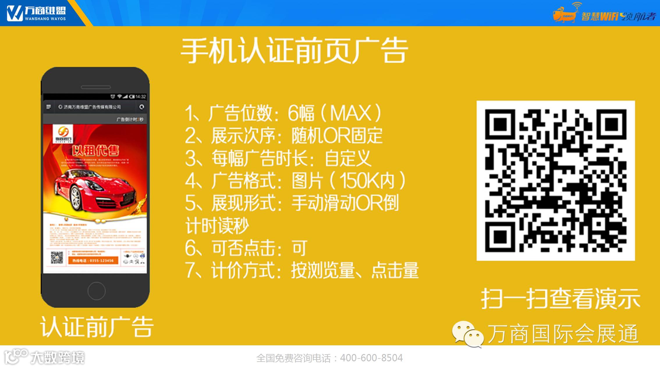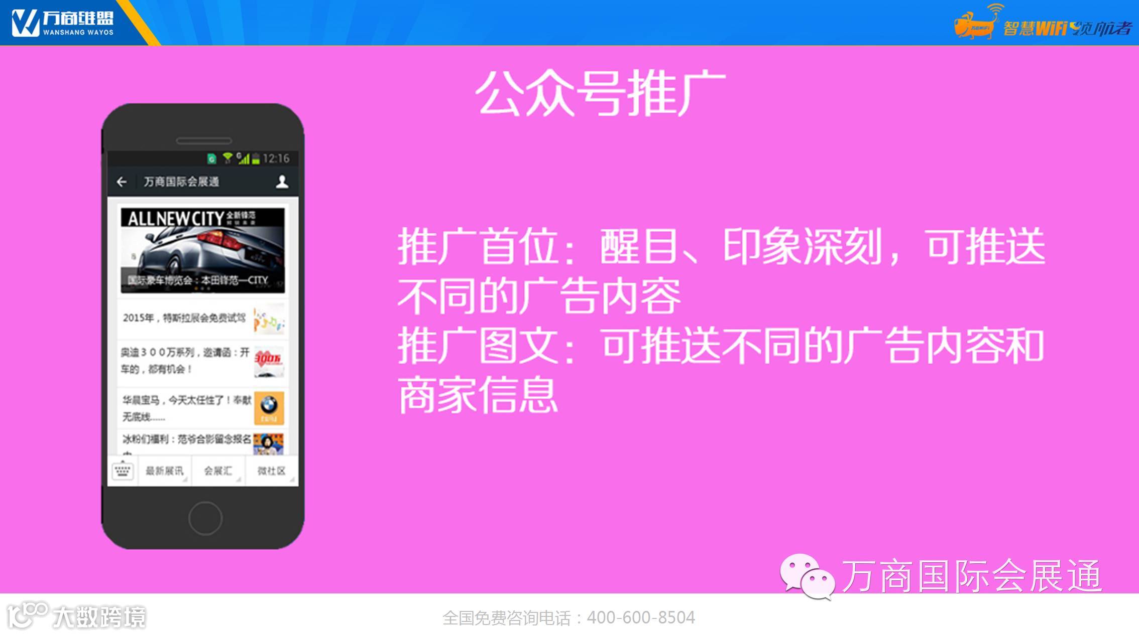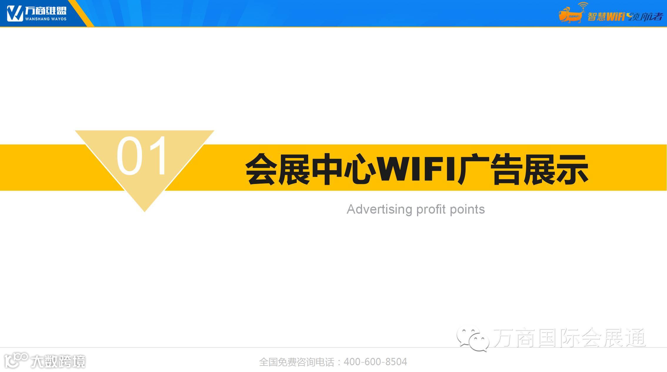 万商国际会展通专业的会展信息提供商,整合全国会展中心,为参展商提供专业的wifi营销和移动互联网宣传。