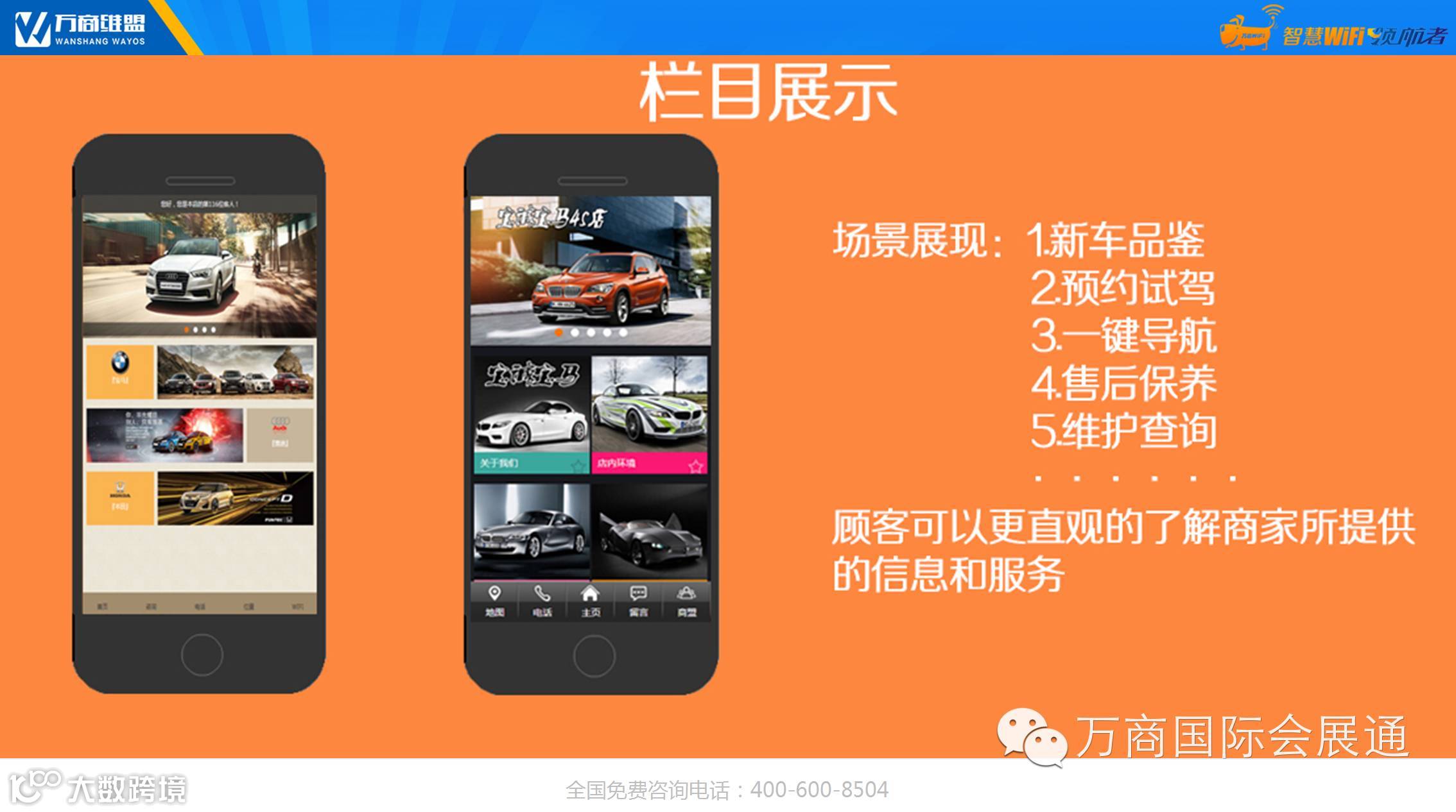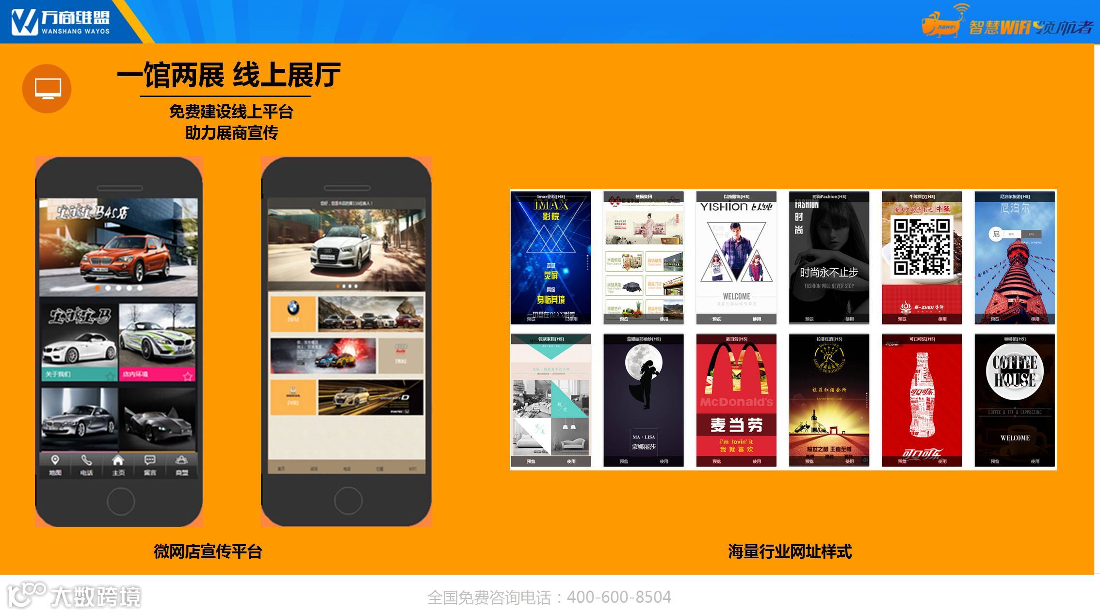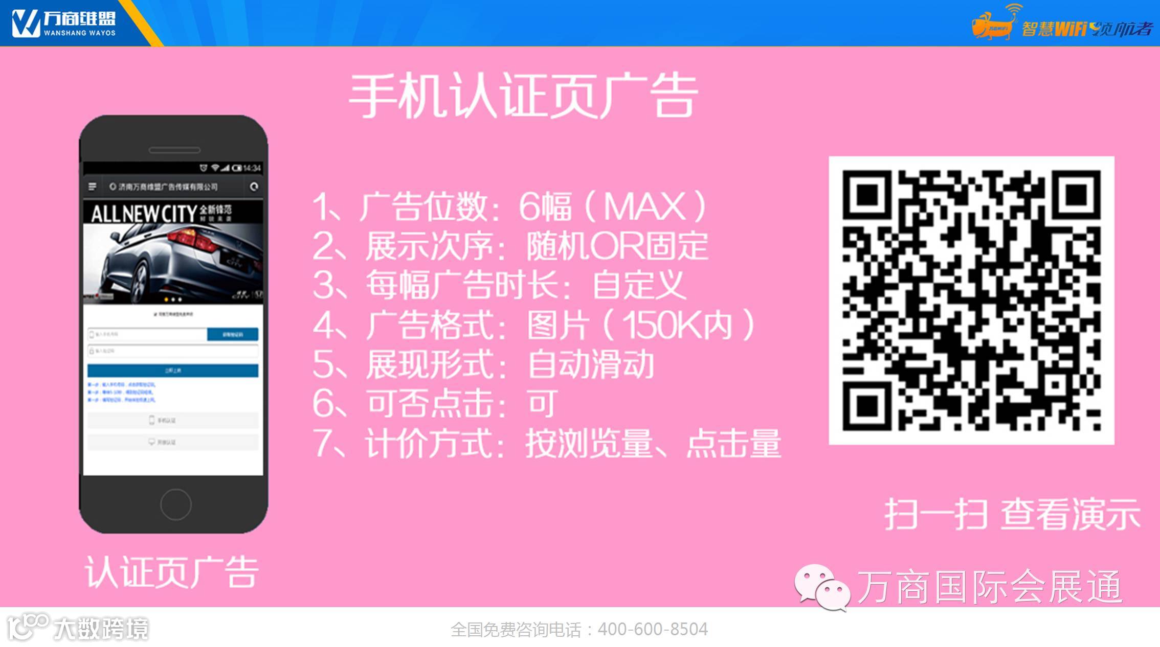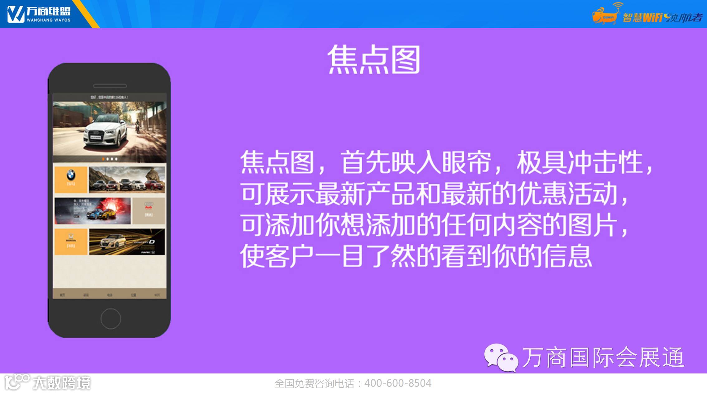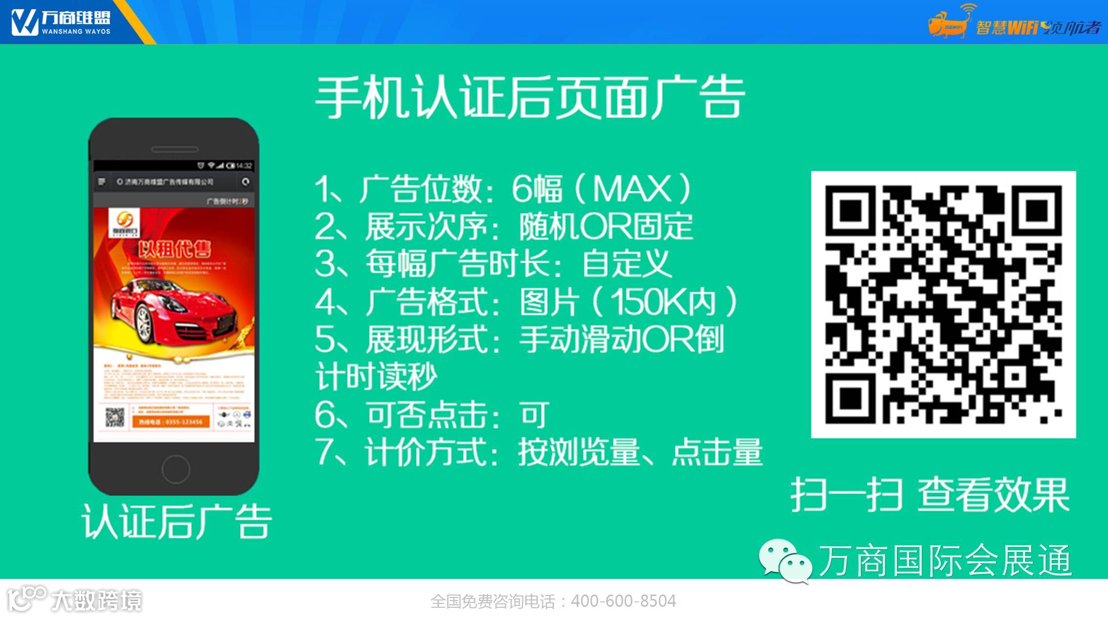 万商国际会展通专业的会展信息提供商,整合全国会展中心,为参展商提供专业的wifi营销和移动互联网宣传。