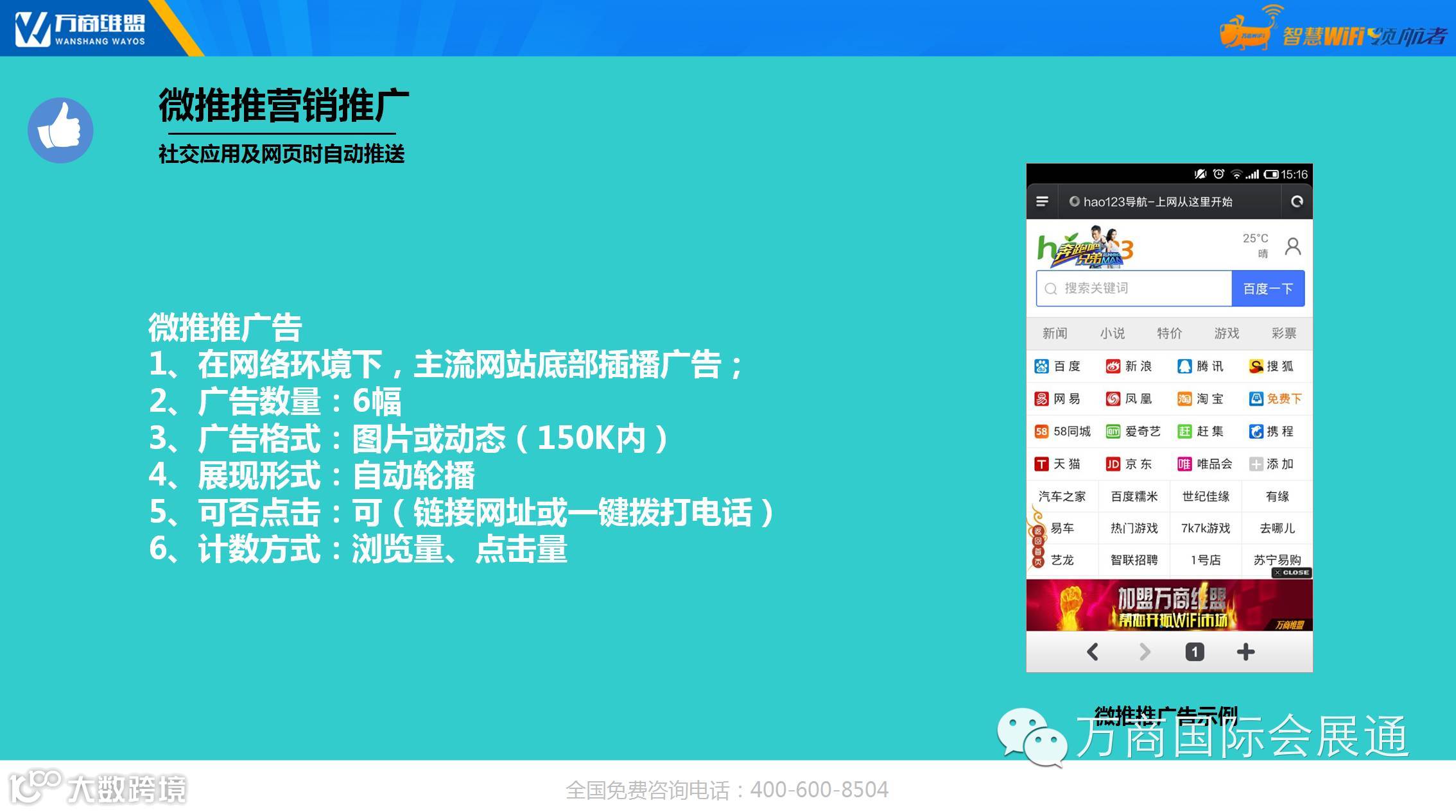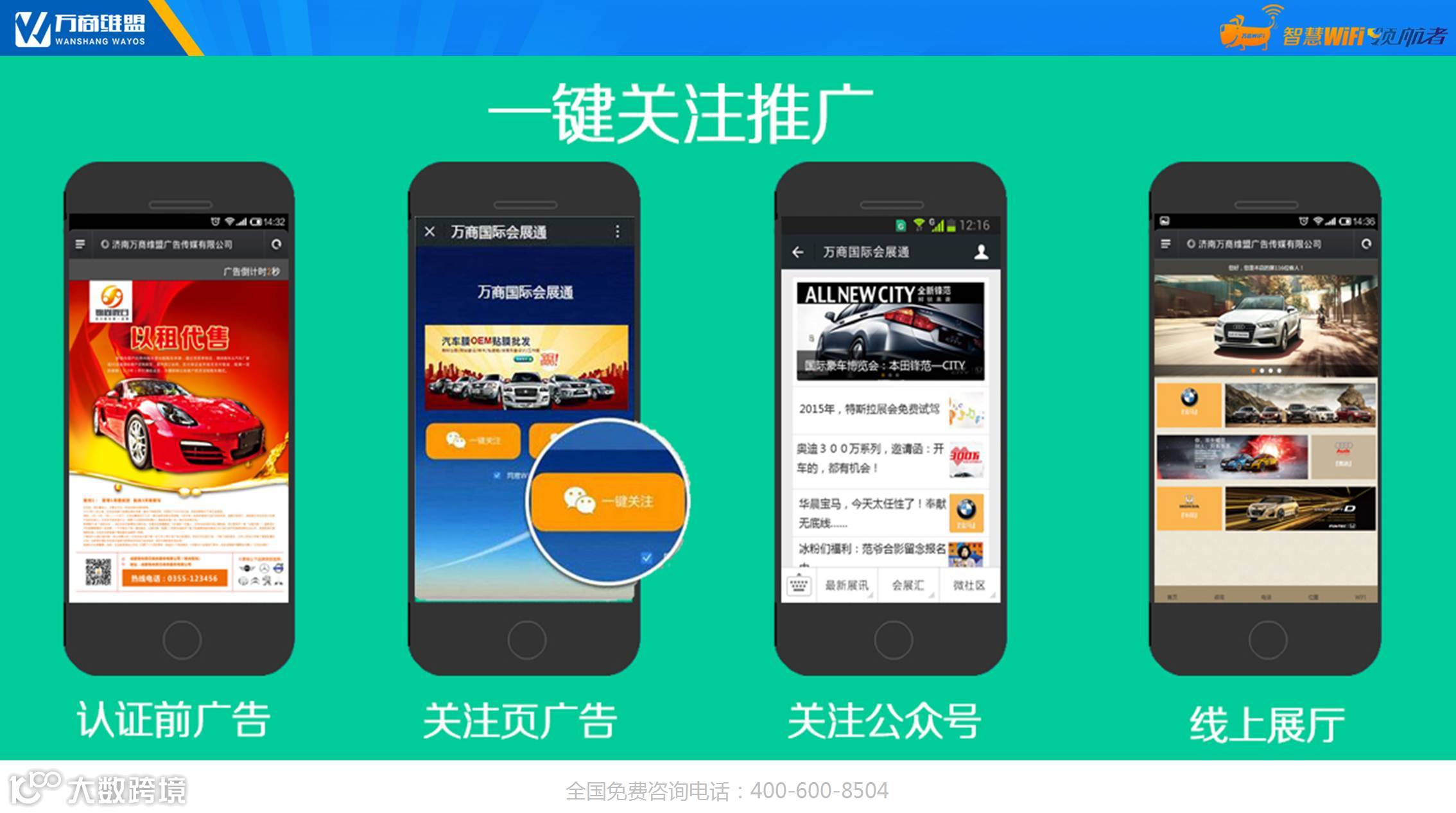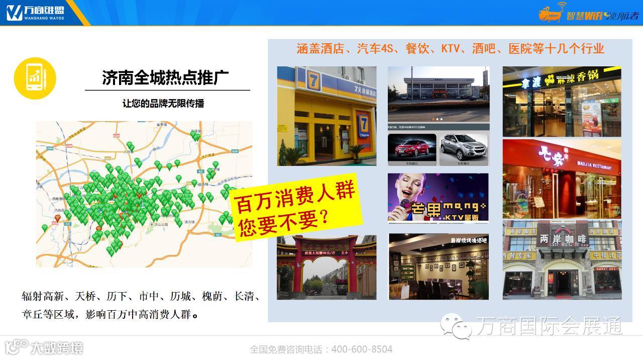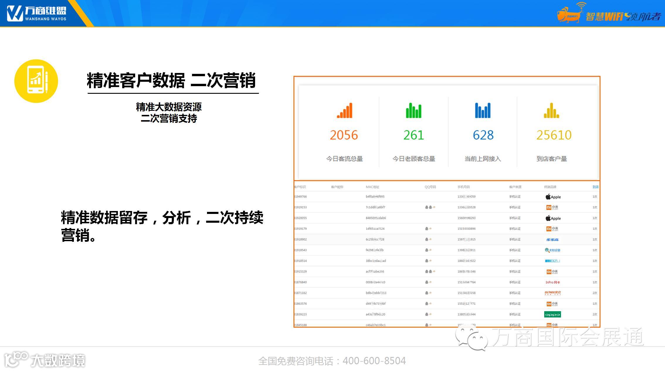万商国际会展通专业的会展信息提供商,整合全国会展中心,为参展商提供专业的wifi营销和移动互联网宣传。