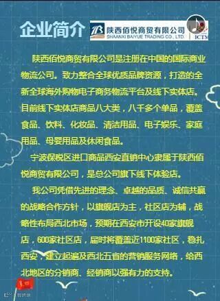 陕西佰悦商贸有限公司是注册在中国的国际商业物流公司。致力整合全球优质品牌资源,打造的全新全球海外购物电子商务物流平台及线下实体店。线下实体店商品九大类,八千多个单品,覆盖酒水饮料、化妆品、清洁日化、电子娱乐、家庭用品、母婴用品及休闲食品