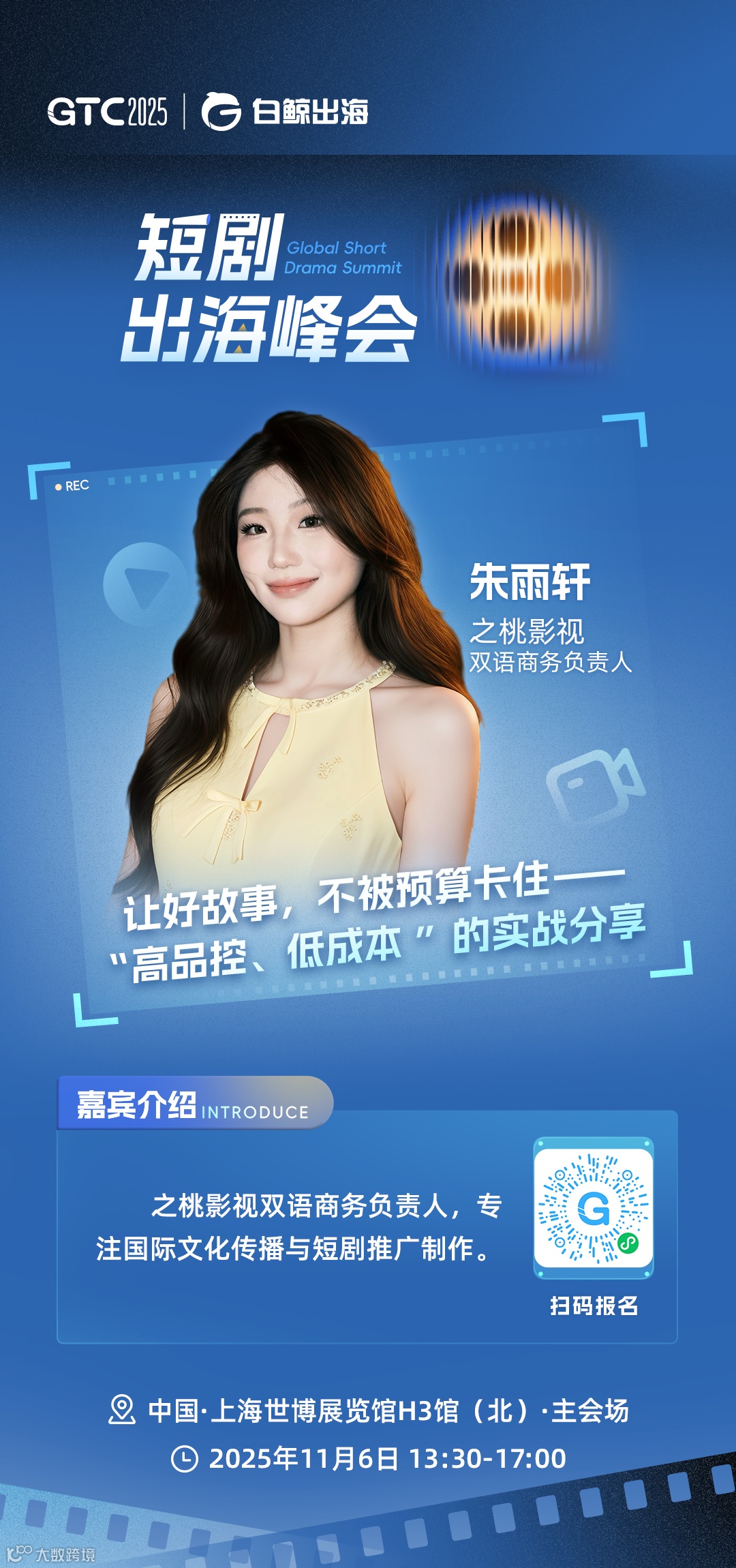 对于想要布局短剧出海的创作者、制作方而言,朱雨轩的实战智慧,是破解“成本焦虑”与“品控担忧”的关键钥匙。11月6日,来上海世博展览馆H3馆(北)主会场,听她讲述如何用“高品控、低成本”的组合拳,让中国短剧的好故事在全球市场持续破圈!