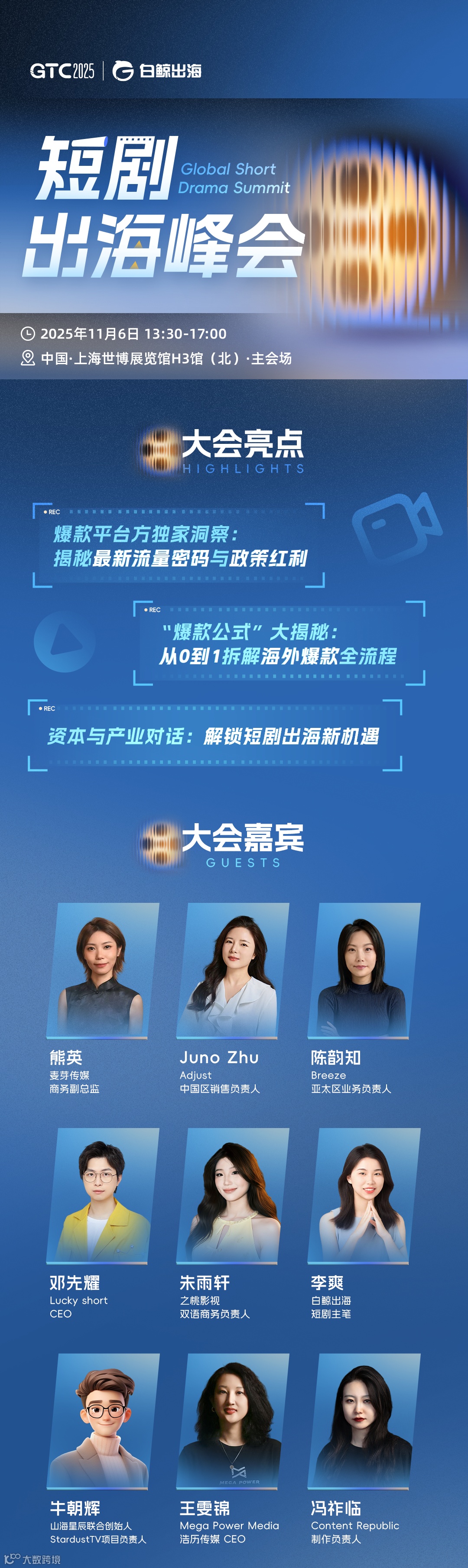 在即将2025年11月6日举办的GTC2025短剧出海峰会上,她将带来《让好故事,不被预算卡住 ——“高品控、低成本” 的实战分享》。这场分享,是她对无数个日夜打磨短剧出海项目的经验萃取。