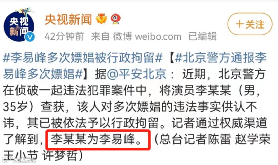 9月11日17时左右,有消息称,演员李某某(男,35岁)因多次pc被查获,本人对违法事实供认不讳,已被依法行政拘留。而李某某就是李易峰。