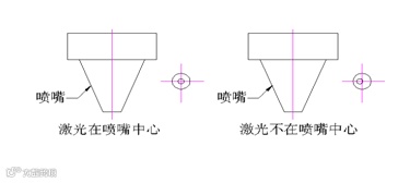 查看外形有没有碰伤情况,特别是有斜度的地方;保证切割时气流顺畅,如切割产生的熔渣残留在喷嘴上,必须立即清除。可用直径为1mm的钢丝穿过喷嘴清除熔渣。如果喷嘴口遭到碰伤,整个圆孔已经不圆,则喷嘴将无法使用的,必须更换。调光时检查激光是否在喷嘴的中心。如下图所示。