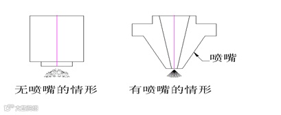 喷嘴的设计和喷气流动的情形,直接影响到切割的质量;喷嘴的制造精度,与切割品质息息相关。喷嘴的主要功能有:防止切割熔渍等杂物往上反弹进入切割头损坏聚焦镜片。喷嘴可以改变切割气体喷出的状况,可控制气体扩散的面积及大小,从而影响到切割质量。下图为安装喷嘴和不安装喷嘴的时候,气体喷出的情形。