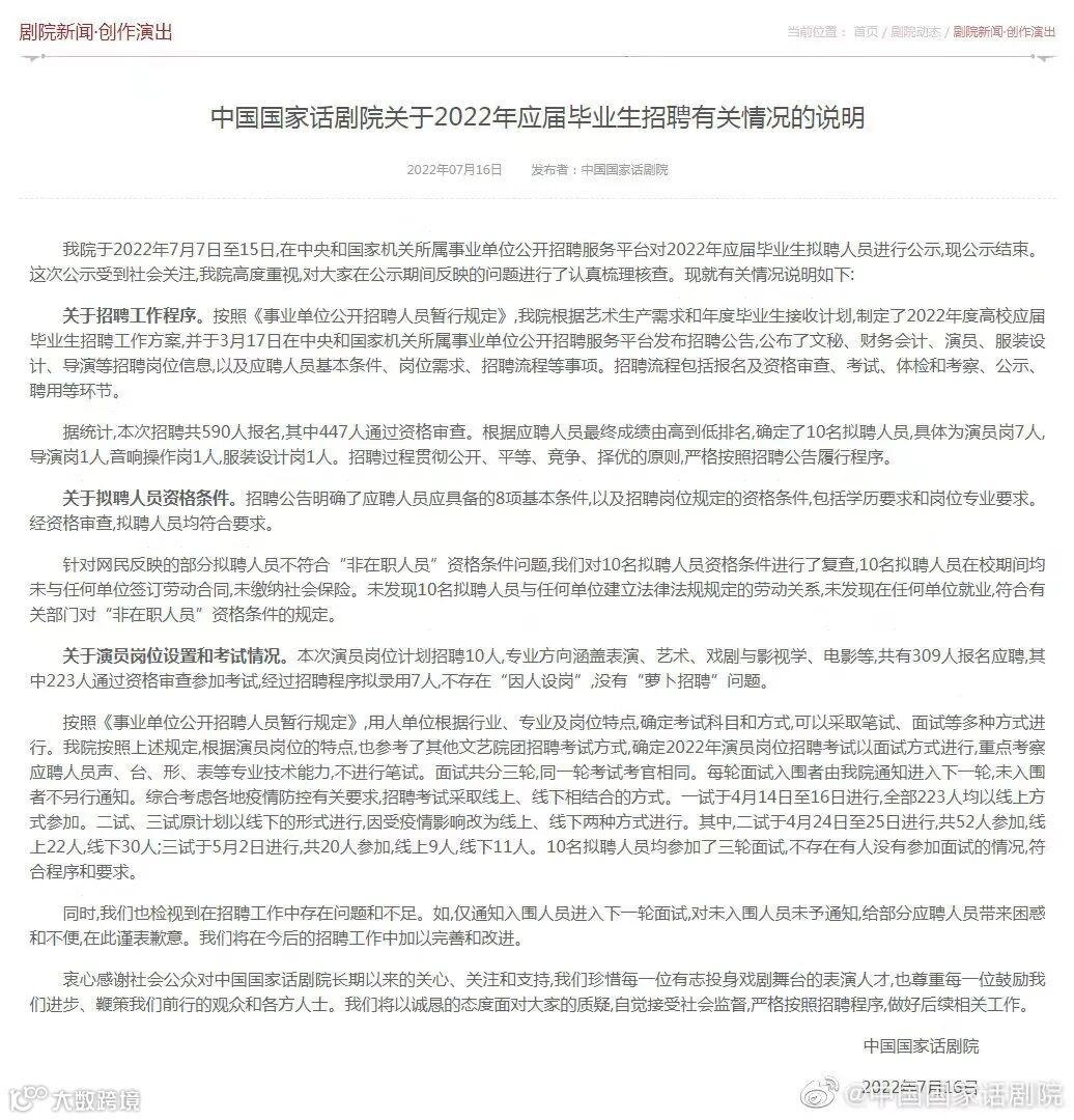 7月16日,国家话剧院就此事发表声明,称招聘过程符合程序和规定,不存在“因人设岗”,没有“萝卜招聘”问题,也没有人不参加面试的情况。