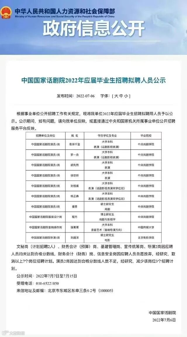 7月6日,中国国家话剧院(简称“国家话剧院”)公布了2022年应届毕业生拟聘人员名单,共有10人进入公示名单。其中易烊千玺、罗一舟、胡先煦等八人,均为中央戏剧学院的应届毕业生,除一位博士研究生应届生拟聘岗位为服装设计岗,其余七位均为演员岗。对此,有公众对他们是否符合招聘资格、招聘过程是否合规等提出质疑,引起广泛关注。