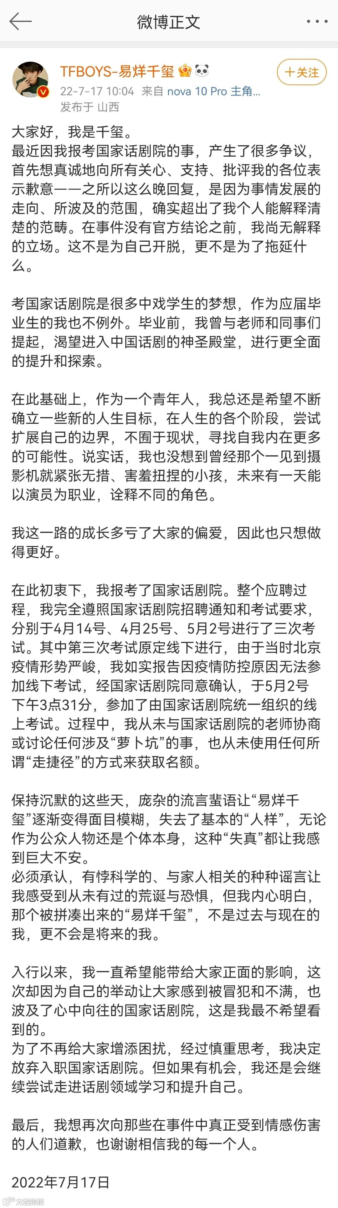 7月17日上午,演员、歌手易烊千玺在微博发文,对自己报考国家话剧院一事作出回应,并表示,为了不再给大家增添困扰,经过慎重思考,他决定放弃入职国家话剧院。