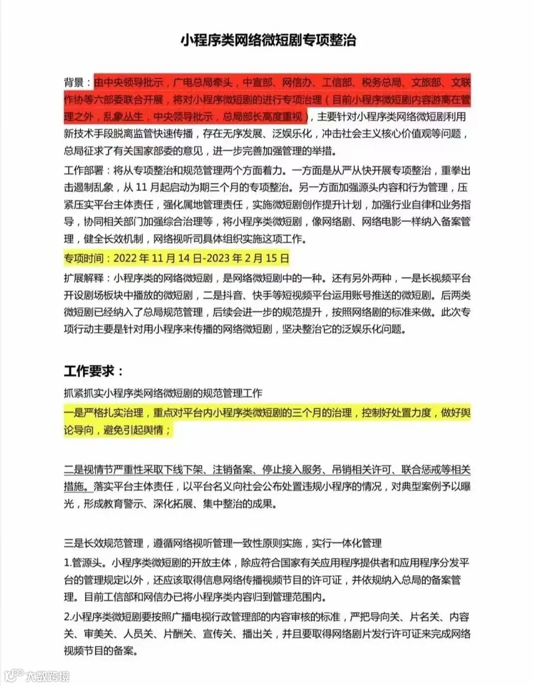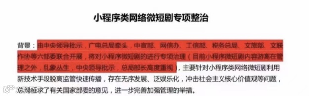 由中央领导批示,广电总局牵头,中宣部、网信办、工信部、税务总局、文旅部、文联作协等六部委联合开展,将对小程序微短剧的进行专项治理(目前小程序微短剧内容游离在管理之外,乱象丛生,中央领导批示,总局部长高度重视)主要针对小程序类网络微短剧利用新技术手段脱离监管快速传播,存在无序发展、泛观乐化,冲击社会主义核心价值观等问题,总局征求了有关国家部委的意见,进一步完善加强管理的举报。