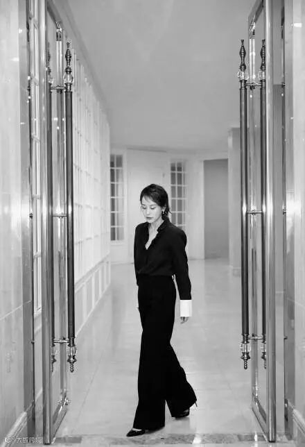 42岁的海清搭配一如简洁大方又干练,黑色衬衣配黑色阔腿裤,简单高级。