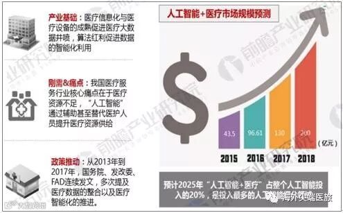 在政策推动和算法红利的促进下,“人工智能+医疗”快速发展,根据前瞻产业研究院发布的《智能医疗行业发展前景与投资分析报告》统计,2016年中国智能医疗市场规模达到96.61亿元,增长率为37.9%,中国智能医疗市场规模在持续增长,2017年将超130亿元,增长40.7%,有望在2018年市场规模达到200亿元。