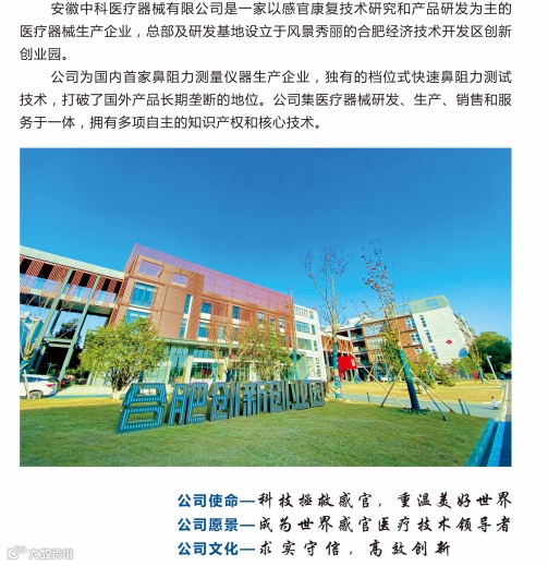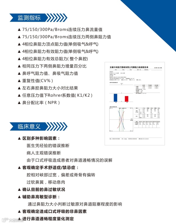 公司为国内一家鼻阻力测量生产企业,拥有的档位式快速鼻阻力测试技术,打破了国外产品长期垄断的地位。公司集医疗器械研发、生产、销售和服务于一体,拥有自主的知识产权和核心技术。 国产鼻阻力,可替代进口!
