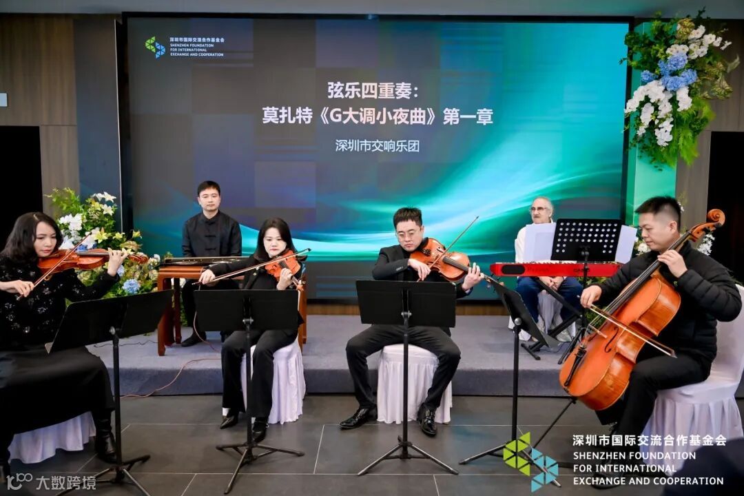 会议在一场别开生面的艺术表演中拉开帷幕。深圳市古琴昆曲研究会执行会长刘剑与美籍音乐人、作曲人 Don Rechtman 联袂献上古琴、钢琴合奏《半山听雨》,以及古琴独奏《山海情》,随后深圳市交响乐团以弦乐四重奏演绎莫扎特《G大调小夜曲》第一章,为现场嘉宾带来了一场中西对话、跨越时空的文化盛宴。