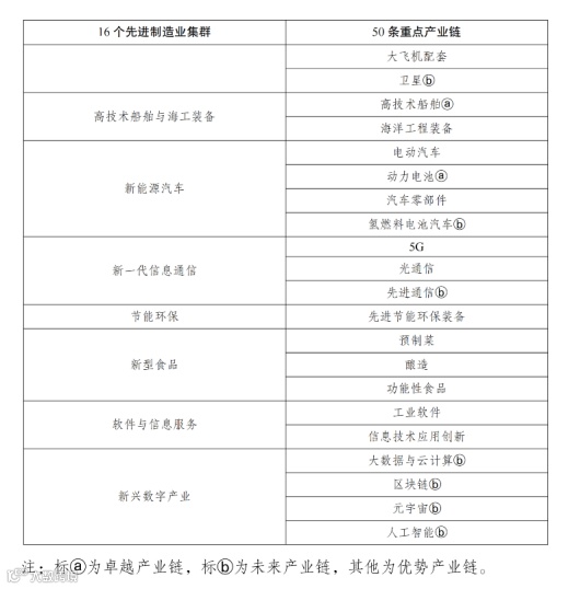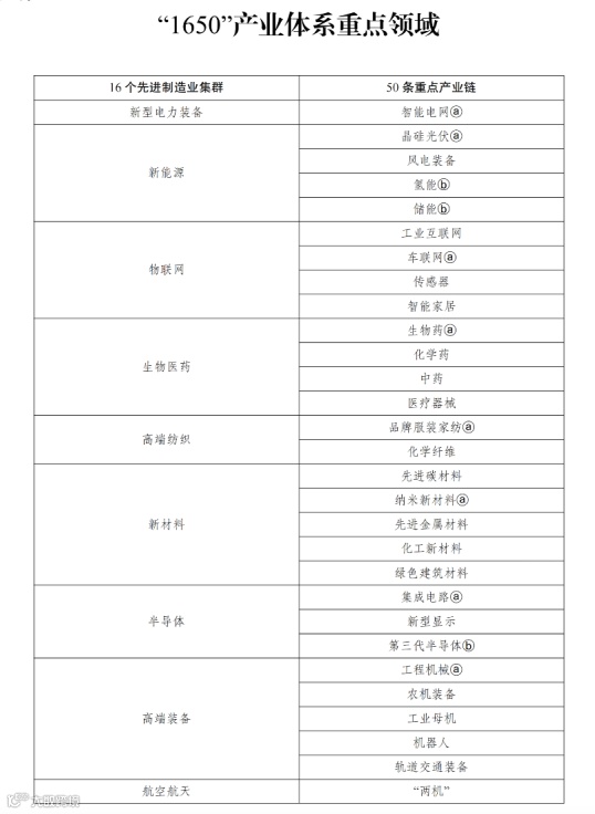 “1650”即16个先进制造业集群和50条重点产业链,分别为: