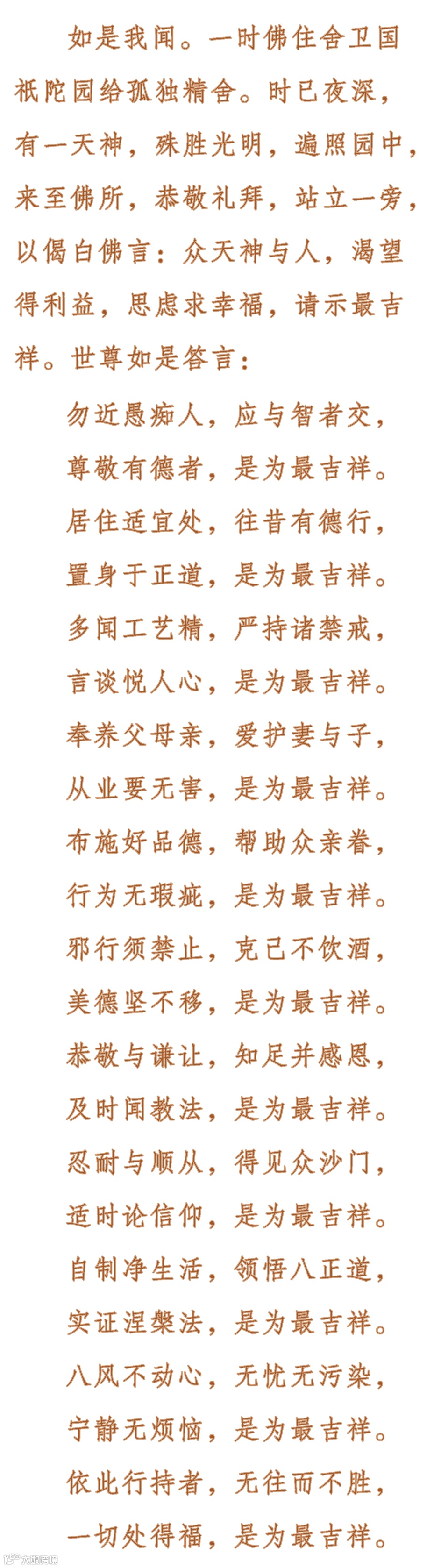 《大吉祥经》虽然简短,但很扼要。佛陀在其中开示了个人、家庭乃至社会,获得安定团结、清净祥和的方法,叙述了贤者日常生活乃至证得涅槃的吉祥之道。依教奉行,则无往不胜、无处不安、无时不顺。