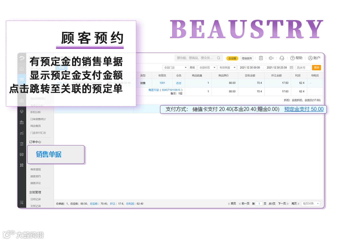 (2)有预定金的销售单据,显示预定金支付金额,点击对应跳转至关联的预定单