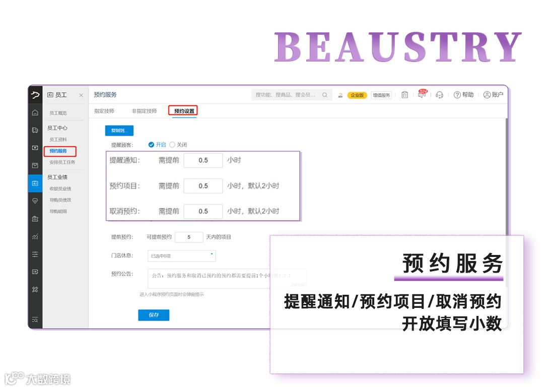 12、预约服务,提醒通知/预约项目/取消预约开放填写小数