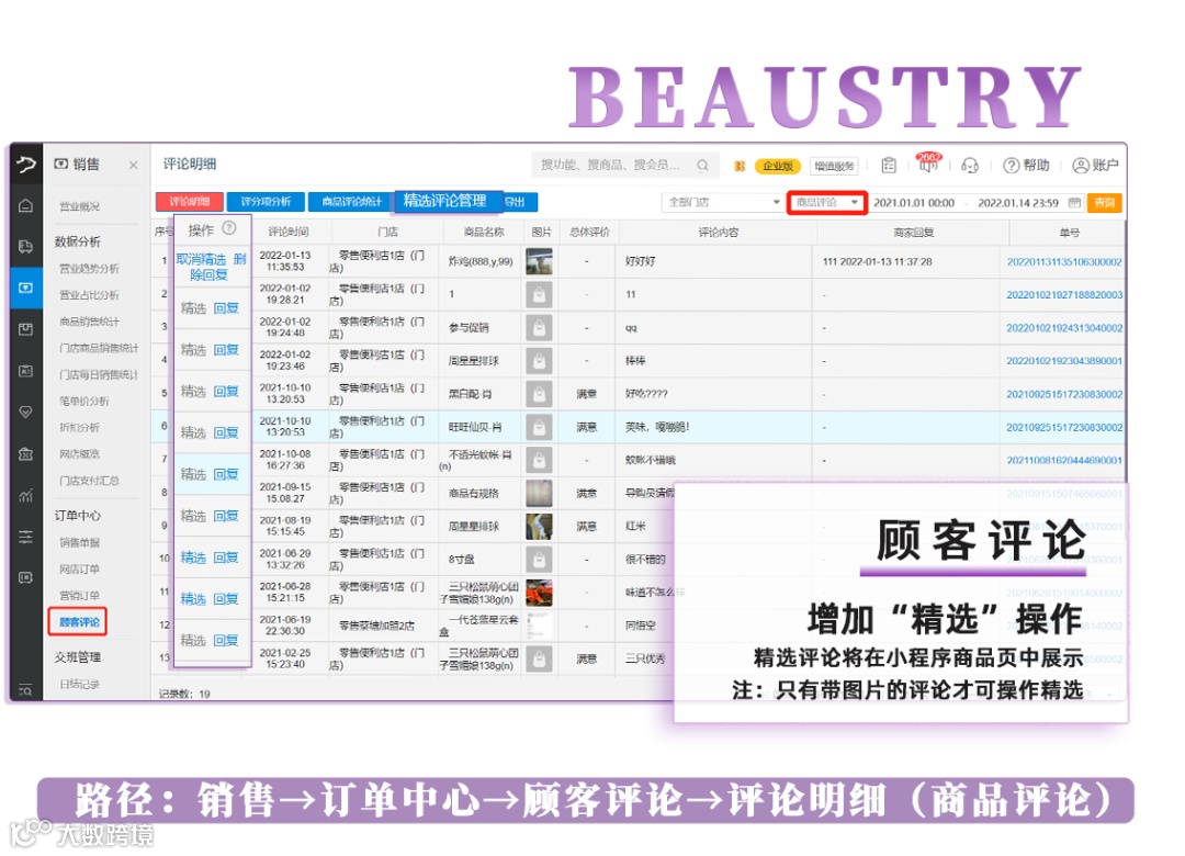 (1)精选操作:带图片的商品评论支持添加到精选评论,精选评论将在小程序商品页中展示,能刺激更多消费者下单。(注:只有带图片的评论才可操作精选)