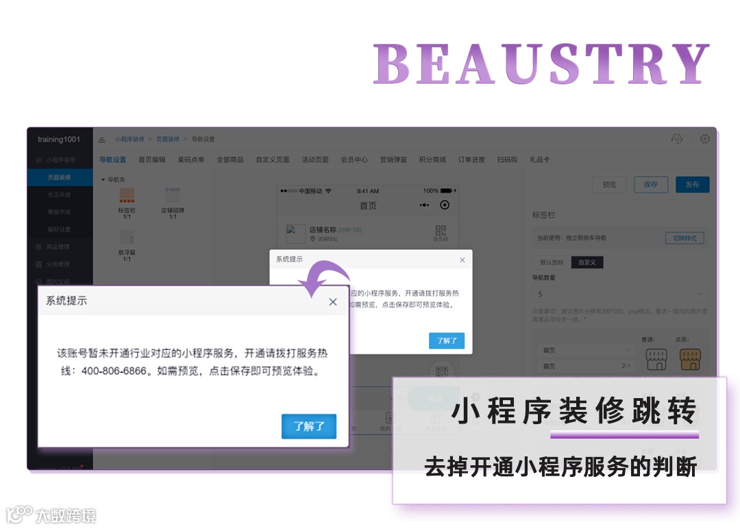 未开通小程序服务的商户也可前往小程序装修工具后台装修,可保存装修效果,但是不能发布,发布时会提示