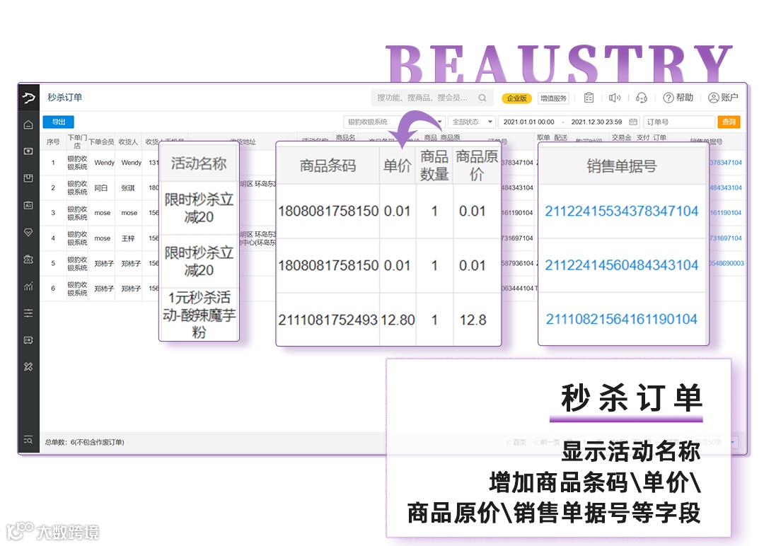 6、秒杀订单,增加商品、关联单据等相关字段(增加“商品条码“、“单价”、“商品原价”、“销售单据号”列)