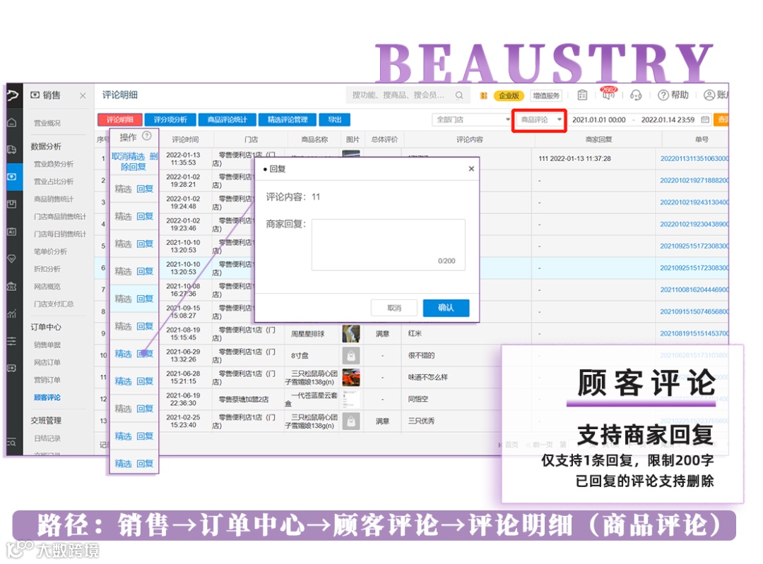 (1)选择评论进行回复,仅支持1条回复,限制200字