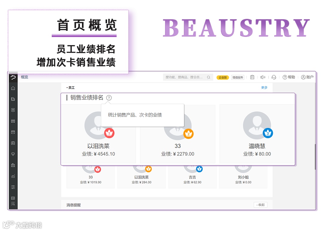 9、美业首页概览的员工业绩排名增加次卡销售业绩(销售业绩排名统计销售产品、次卡的业绩)