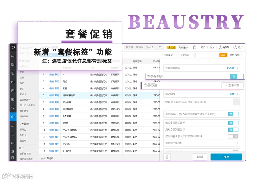 总部给套餐活动打套餐标签,方便门店员工直观了解套餐活动(如:新客活动,开业活动,日常活动),员工推荐客户参与活动快速收银。