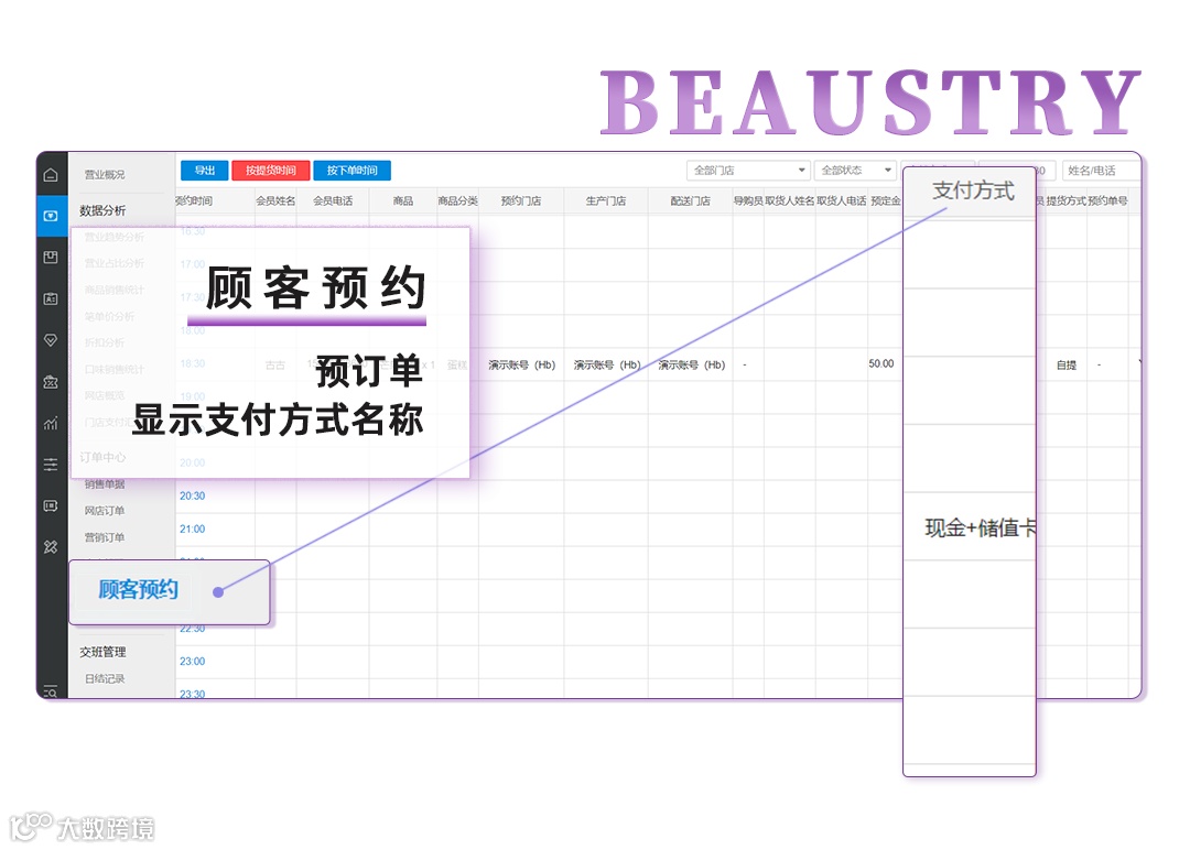(1)顾客预约中显示的预订单,显示支付方式名称