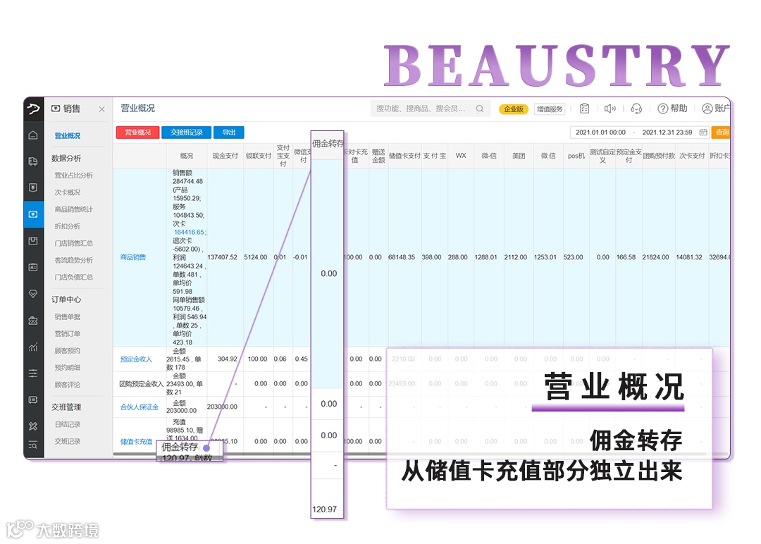 10、营业概况,兼容合伙人佣金转存到赠送余额的数据(佣金转存从储值卡充值部分独立出来,独立一项为【佣金转存】 ,不计入销售额,也不计入营业实收。)