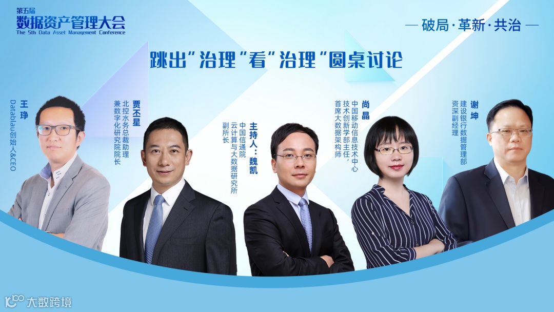 本次大会还特别设置圆桌环节,由魏凯主持,邀请中国移动信息技术中心技术创新学部主任首席大数据架构师尚晶、建设银行数据管理部资深副经理谢坤、北控水务总裁助理兼数字化研究院院长贾丕星、Datablau创始人兼CEO王琤,围绕“跳出治理看治理”开展圆桌讨论。