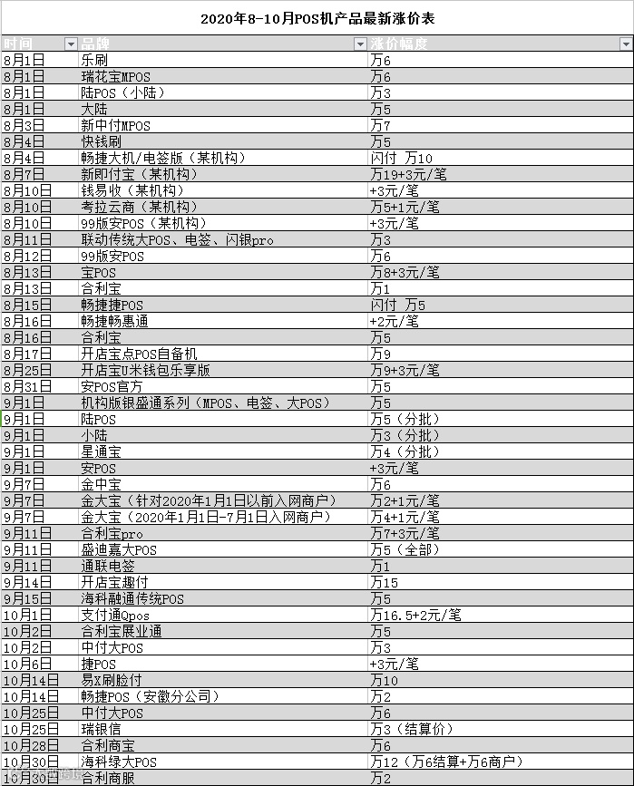自5月份开始至今有很多pos机都已经上调了费率,其中,瑞Y信-瑞F传统大pos商户费率上调万7;银S通-epos上调万5;通Y付mpos上调至0.6+3;H科大pos上调万5;畅J电签,大pos上调万5;H付大pos上调万5等……